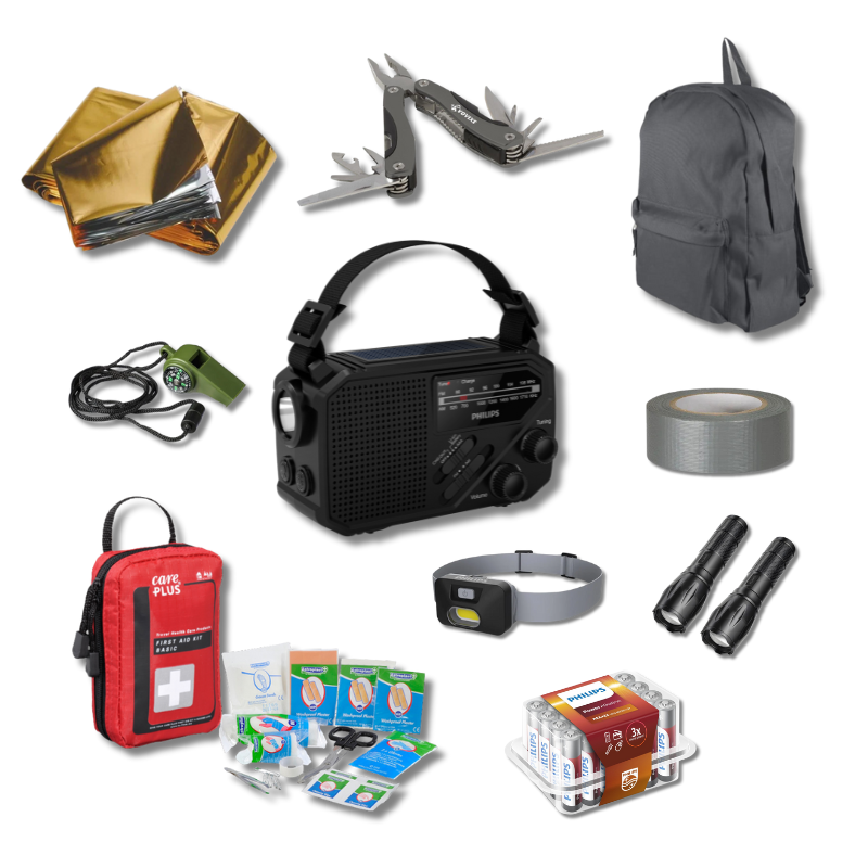 Van verlichting en communicatie tot EHBO, warmte en reparatie – dit noodpakket is jouw basis voor veiligheid in onzekere tijden.