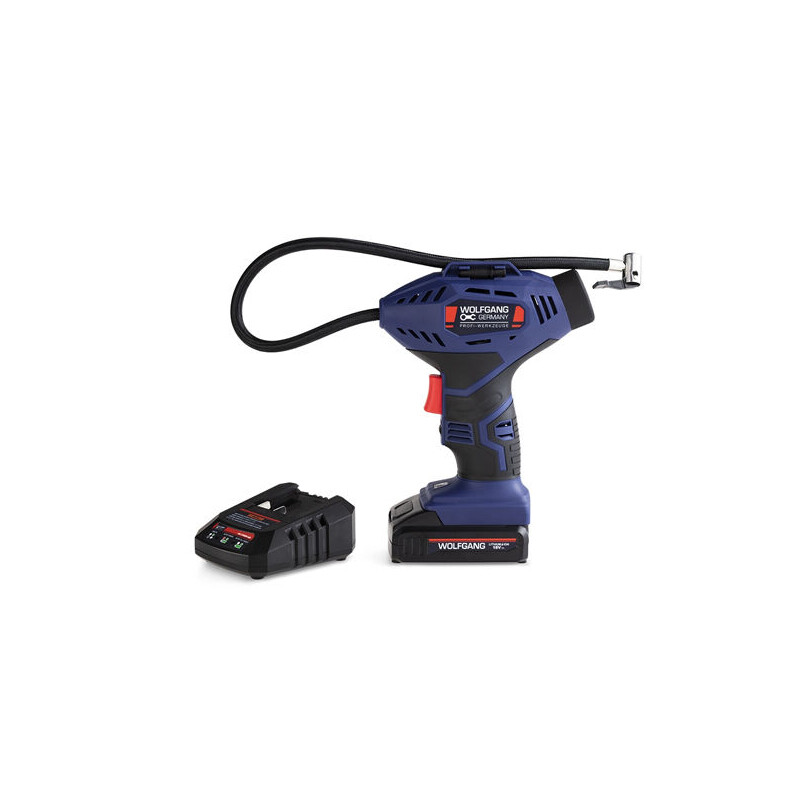 Deze WOLFGANG-luchtcompressor 18V is een onmisbaar product dat staat voor gemak, kwaliteit en betaalbaarheid. Gekenmerkt door een spanning van 18V, maximale druk van 7,5 bar / 100 psi en een 1300 mAh Li-Ion batterij, onze luchtcompressor is klein van formaat, waardoor hij extreem comfortabel en gemakkelijk te hanteren is.